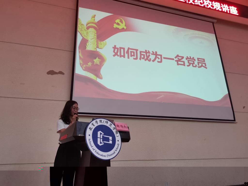 會上,學生黨支部組織委員陸曉清圍繞《如何成為一名黨員》主題為新生做詳細講述。她強調入黨的同志首先要端正入黨動機,那些入黨動機不純,企圖通過黨員稱号獲取好處的決不吸收入黨。接着,她向同學們詳細地講述了入黨的基本流程,幫助同學理清思路,以便做好入黨準備。她着重介紹如何撰寫入黨申請書及注意事項,希望能幫助新生走好入黨第一步。