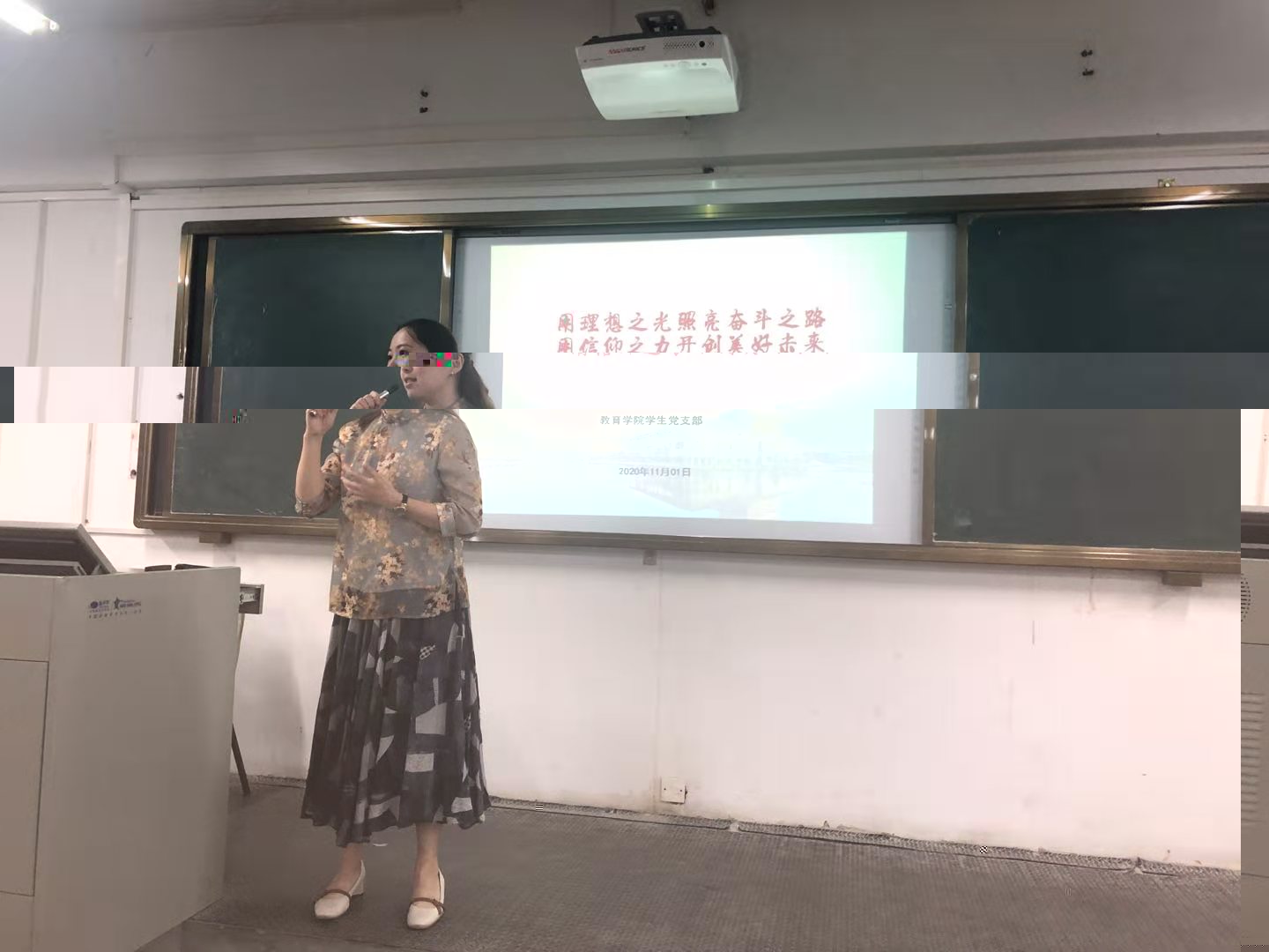 2020年11月1日晚,太阳成集团tyc234cc(師範學院)學生黨支部書記王淩卿在綜合教學樓7B201室為學院分黨校第31期入黨積極分子培訓班上黨課。黨課主題為“用理想之光照亮奮鬥之路,用信仰之力開創美好未來”。