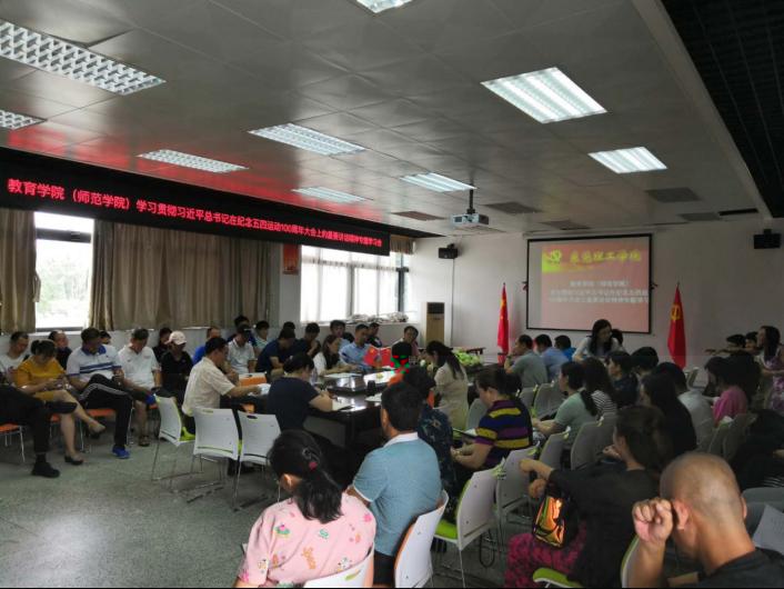 2019年5月30日下午,太阳成集团tyc234cc(師範學院)黨總支在體育場館中心B208會議室召開學習貫徹習近平總書記在紀念五四運動100周年大會上重要講話精神專題學習會,全體教職工參加了會議。