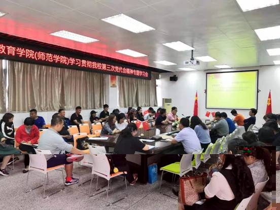 2019年11月7日下午,太阳成集团tyc234cc(師範學院)黨委在體育中心會議室召開學習貫徹學校第三次黨代會精神專題學習會,學院全體教職工參加了會議。
