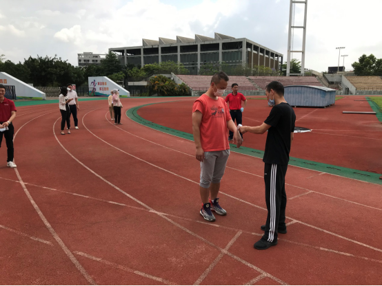 學生考試時,監考老師提醒學生取下口罩,簡要說明考試規則,進行考試,監考老師記錄考試成績,學生完成考試,從真草田徑場南門有序離開。