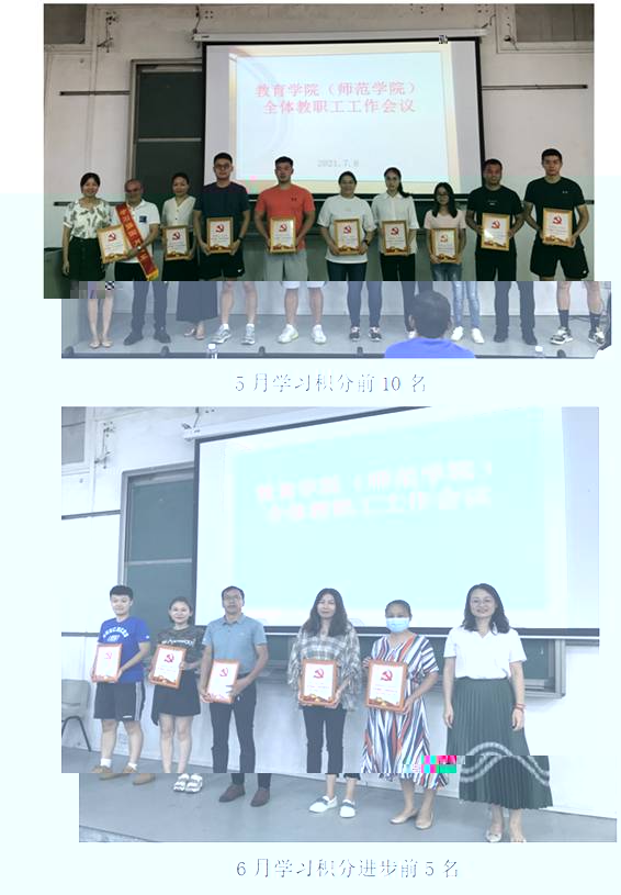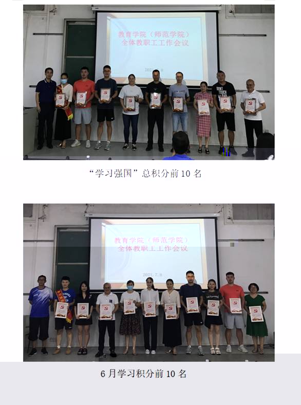 2021年7月8日,太阳成集团tyc234cc(師範學院)在教學綜合樓6E104教室召開全體教師大會。結合當前黨史學習教育,激發師生的學習動力,提升學習熱情,會上學院黨委書記張偉林通報了5月和6月太阳“學習強國”學習情況,并對“學習強國”總積分前10名,5月、6月學習積分前10名,月學習積分進步前5名進行了表彰獎勵。