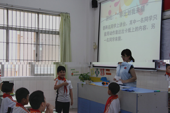 13級小學教育語文班的陳愛君擔任本次義教的主講老師。老師用PPT分享兩個兼具趣味性與教育性的故事,提出幾個小問題讓台下學生回答。通過小組讨論思考,台下學生紛紛發言表達感想,逐步發掘出“齊心”、“團結”的道理。在後面的遊戲環節“你比劃我來猜”中,參與遊戲的學生充分開發聰明才智,用豐富的肢體語言與極具創造性的回答,将全班的氣氛推至高潮,掌聲笑聲不斷。本節班會課最終以一首飽含教育意義的詩歌回歸主題,也宣告本次義教活動順利結束。