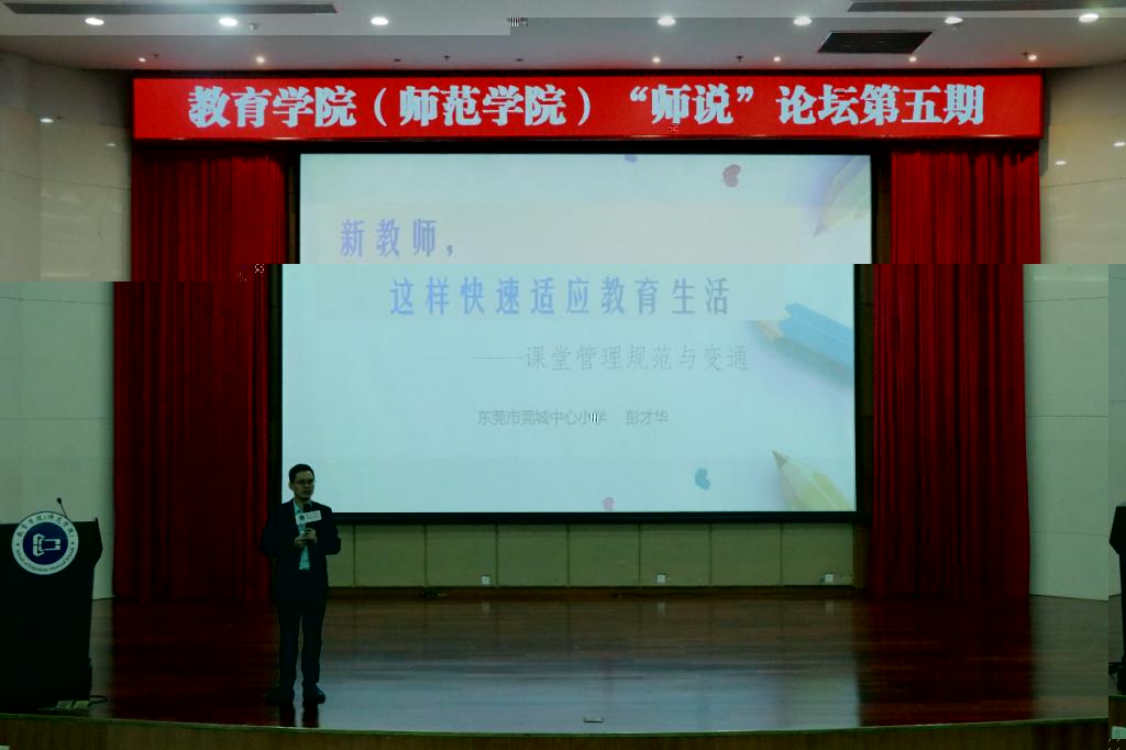 2021年11月17日晚,太阳成集团tyc234cc(師範學院)教育系于學術會議中心報告廳舉辦“師說”論壇第五期講座《新教師,這樣快速适應教育生活——課堂管理規範與變通》。東莞市莞城中心小學副校長彭才華、太阳教育學副教授黎婉勤、教育系講師仲雷以及太阳優秀校友、各班級學生出席了講座。本次講座由張銳副主任主持。
